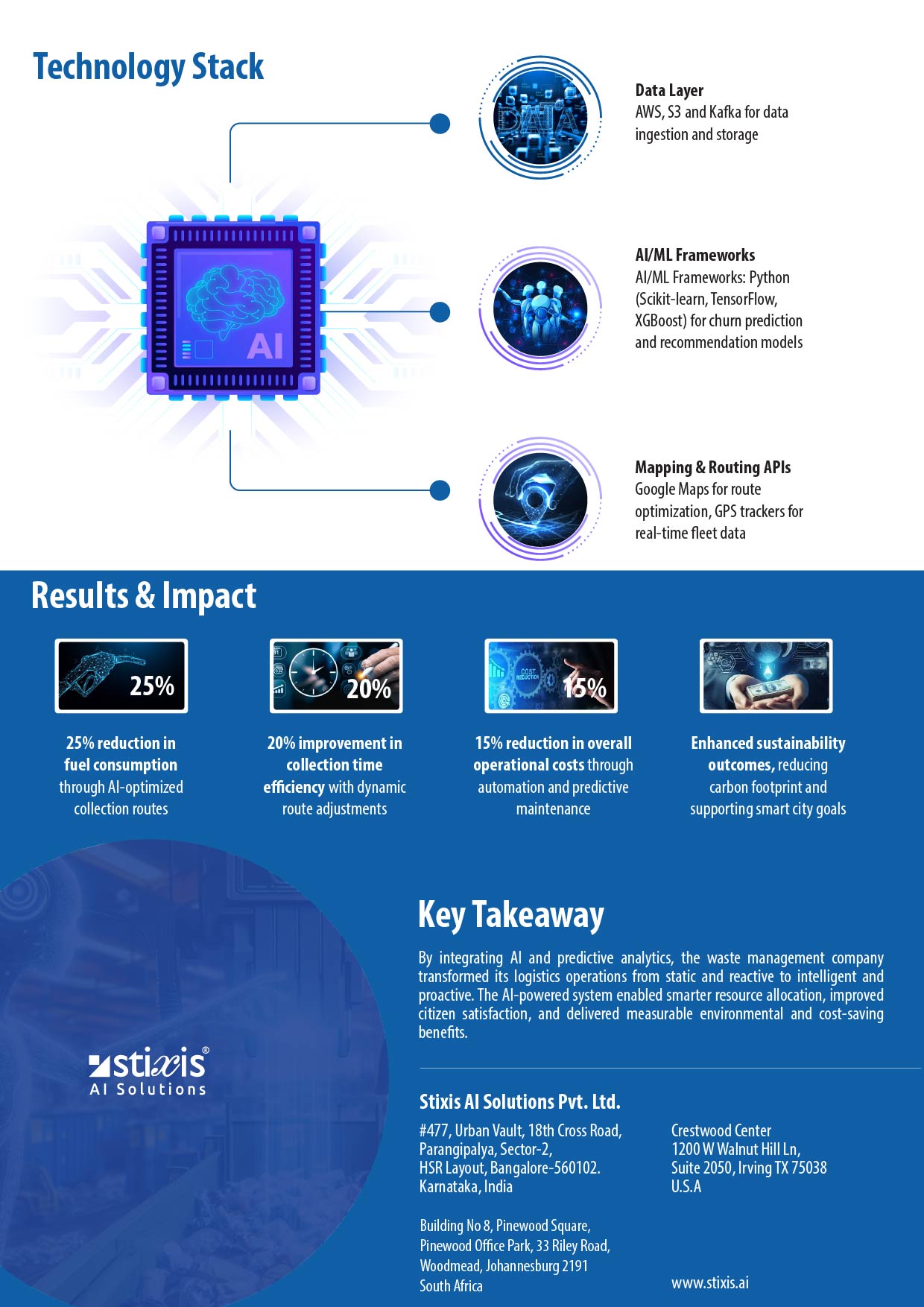 “We collaborated with Stixis AI helped us revolutionize our waste collection operations. Their predictive routing engine, reduced fuel usage and cost optimization models helped us cut operational expenses. The team’s professionalism and deep technical expertise made them an invaluable implementation partner.”
