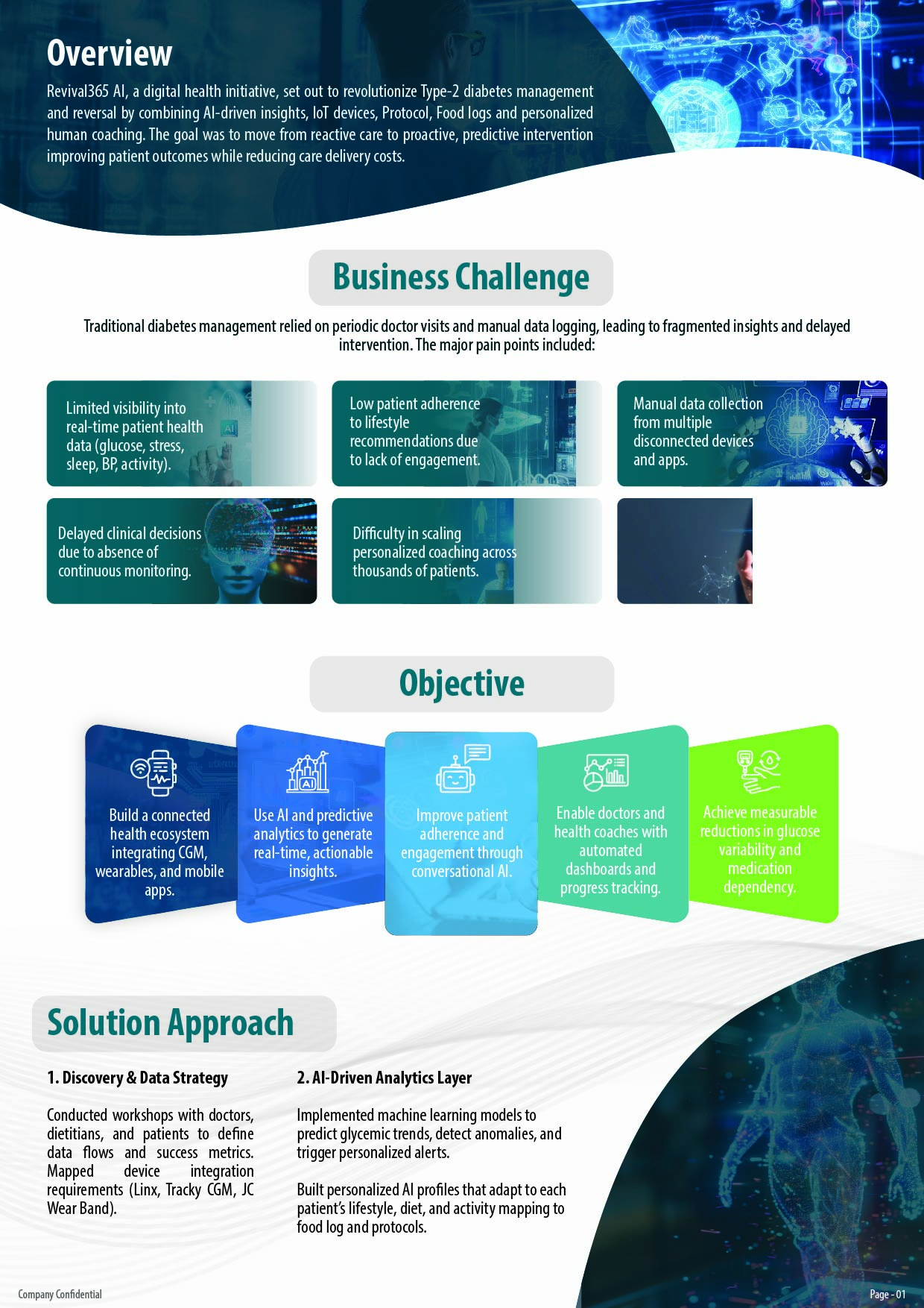 The solution leverages AI-driven insights from health data such as blood glucose readings, physical activity, sleep, stress indicators, and nutritional inputs, combined with IoT integrations including Continuous Glucose Monitoring (CGM) devices and wearable health trackers. Revival365 AI continuously adapts personalized recommendations across diet, exercise, stress management, and medication adherence, supported by nudges, alerts, and predictive risk indicators.