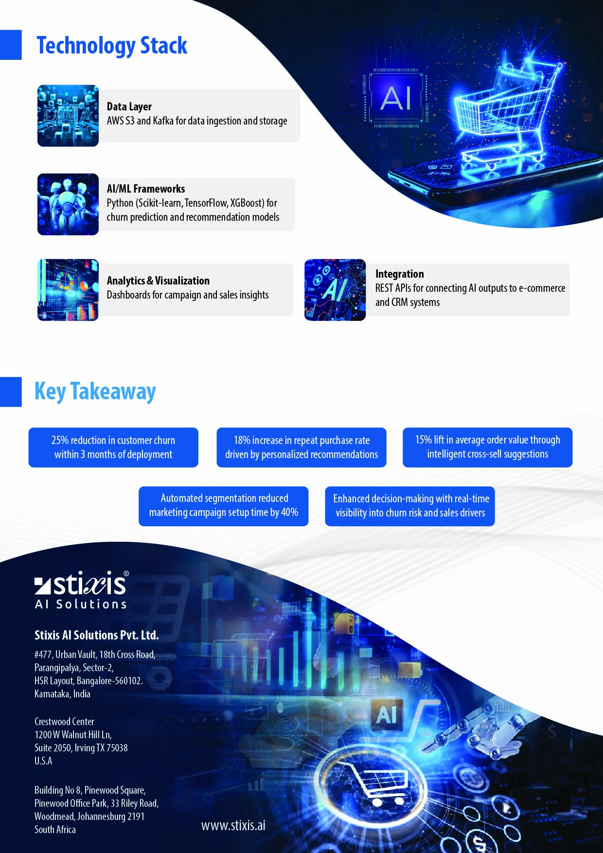 “Stixis AI brought deep AI expertise and a pragmatic implementation approach. Their team seamlessly integrated predictive analytics and customer segmentation into our retail landscape. The end result was a smarter, data-led sales strategy and a 20% boost in campaign performance.”